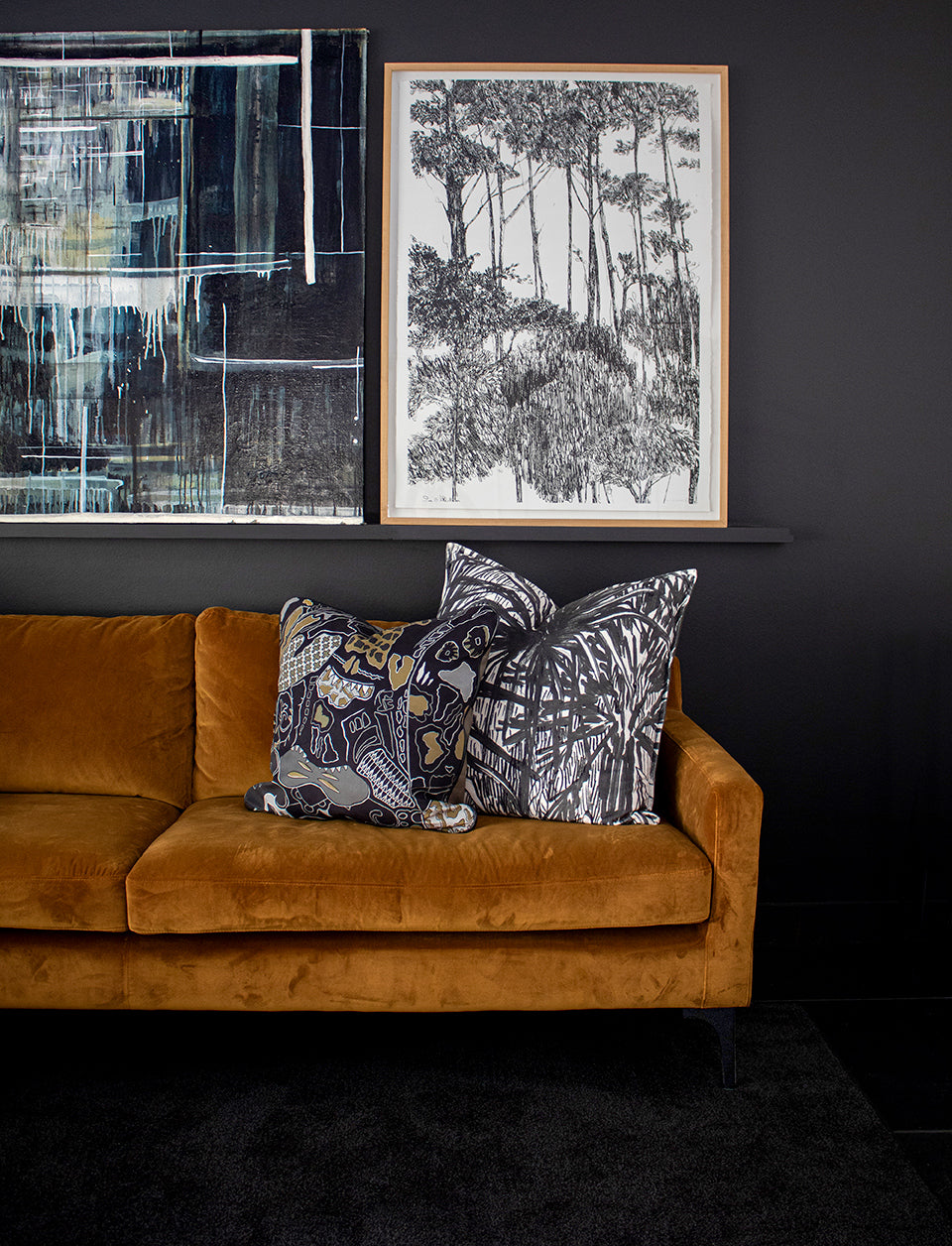 Luxurious printed velvet scatter cushion for interior design featuring a hand painted design by textile designer Nicole Levenberg of Aureum Design. Inspired by the wonders of lush African foliage, the long loopy lines and finely hand detailed texture have become synonymous with the Aureum aesthetic. Designed and made in South Africa.