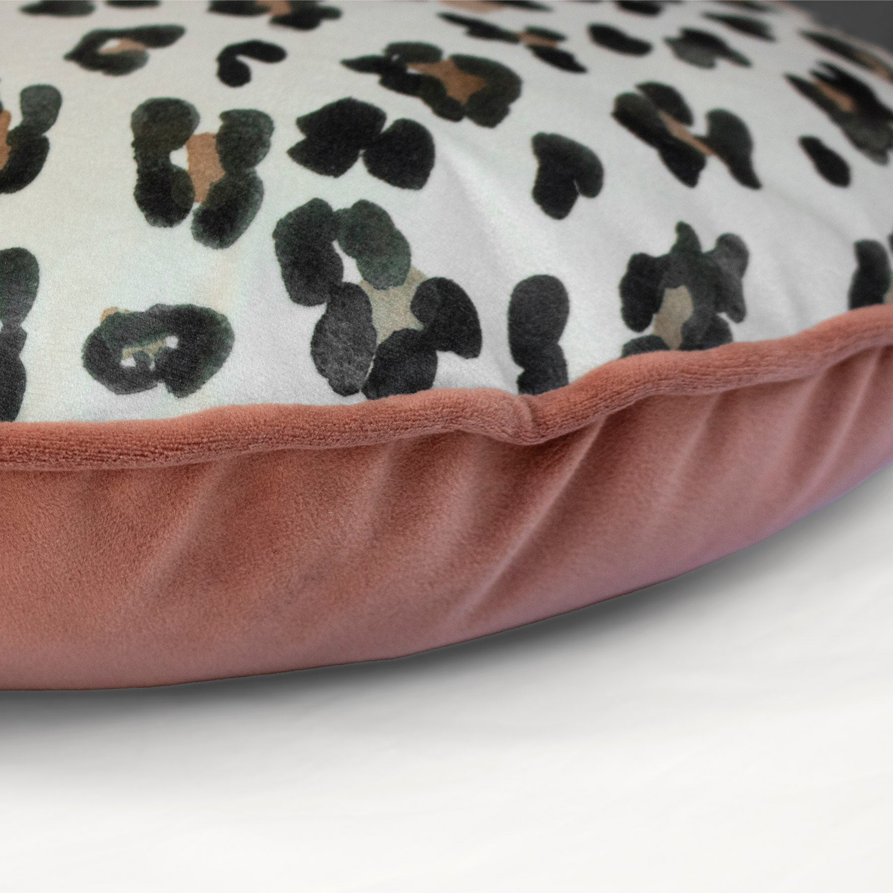 Luxurious velvet scatter cushion for interior in Leopard print by artist Aureum Design with blush pink detailing.