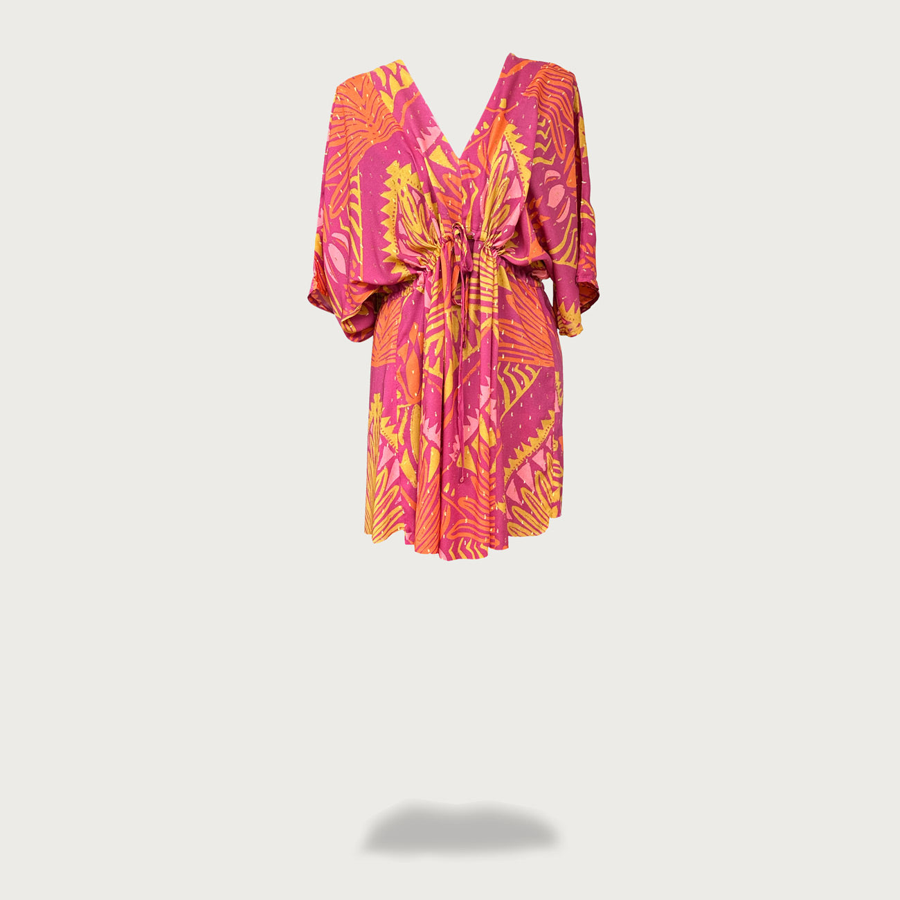 A chic tribal magenta and gold print design in a light cotton/viscose fabric. The fabric is breathable and and adjusts from below the chest for a very flattering drape on any figure. The soft gold flecks woven into the fabric creates a dazzling effect.